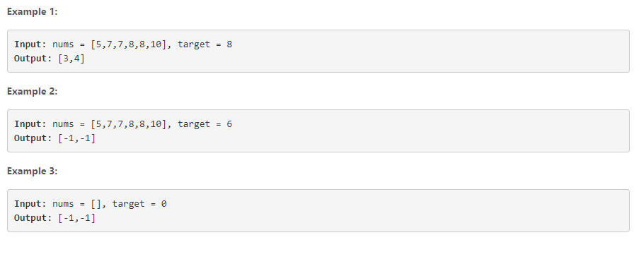 오름차순으로 정렬된 정수 배열이 주어지면 주어진 목표 값의 시작 위치와 끝 위치를 찾습니다.